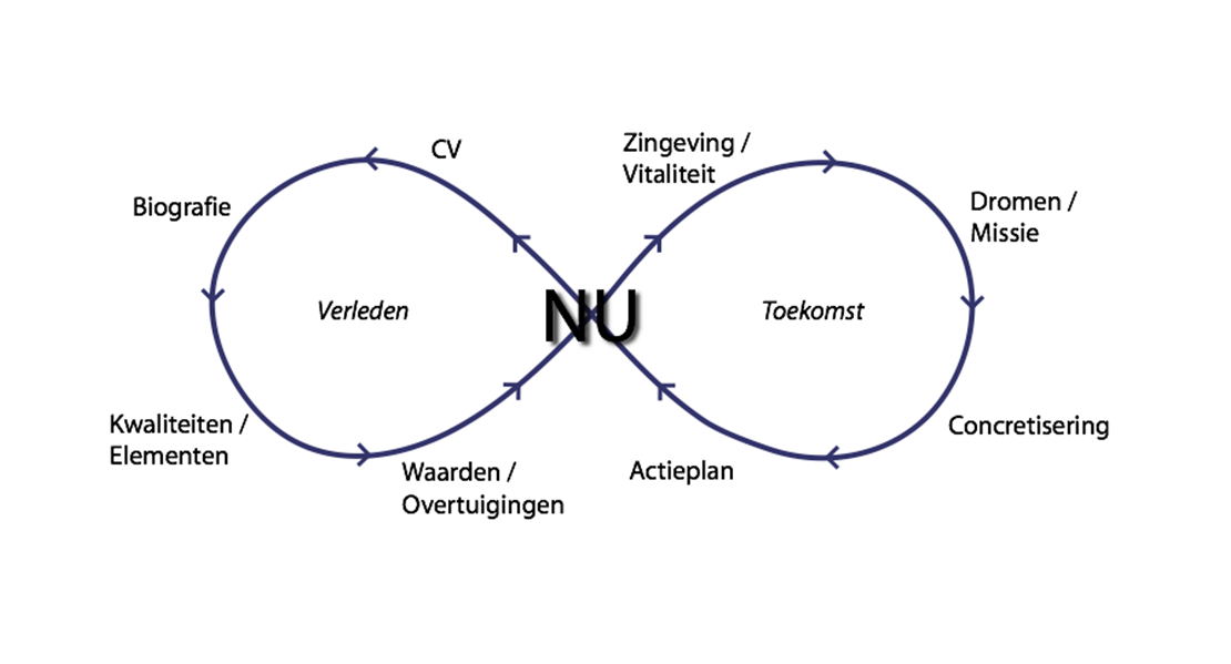 Het Koersonderzoek kan weergegeven worden in de vorm van een Lemniscaat. De opbouw van het Koersonderzoek start bij het verleden, via reflectie op jezelf, naar heden, je kwaliteiten, naar buiten. Ik coach en begeleid jou hierbij van binnen, het ontdekken van jezelf, naar buiten, de stap naar je professionele loopbaan/carrière. Jij bent stuurman van je eigen leertraject.